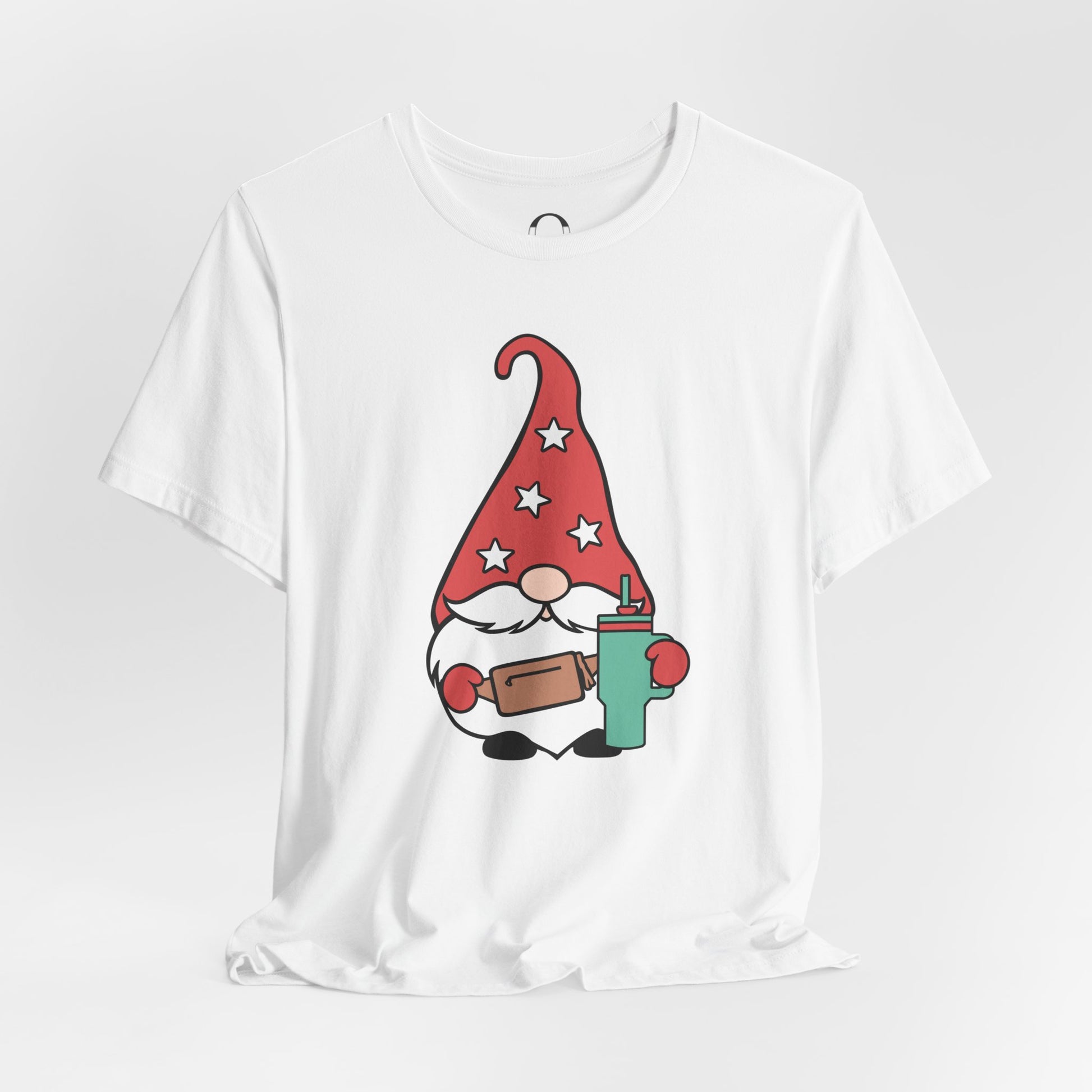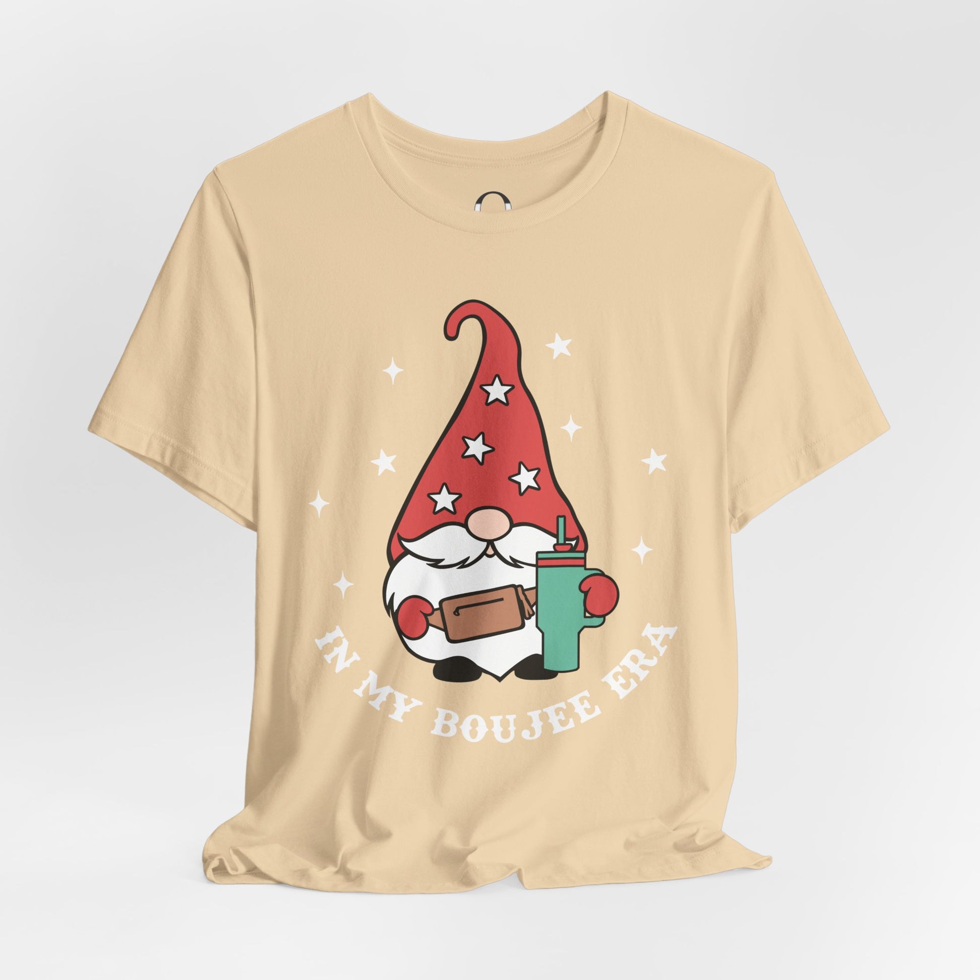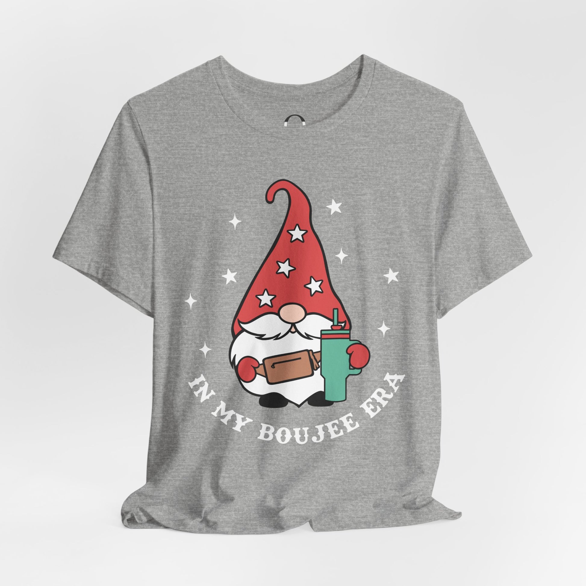 A unisex jersey tee featuring a cute gnome graphic with the text 'in my boujee era'. This tee exudes a playful and whimsical vibe, perfect for casual outings and lounging at home. Ideal for those who enjoy fun and quirky designs. Relevant for everyday wear, lounging, and casual outings.