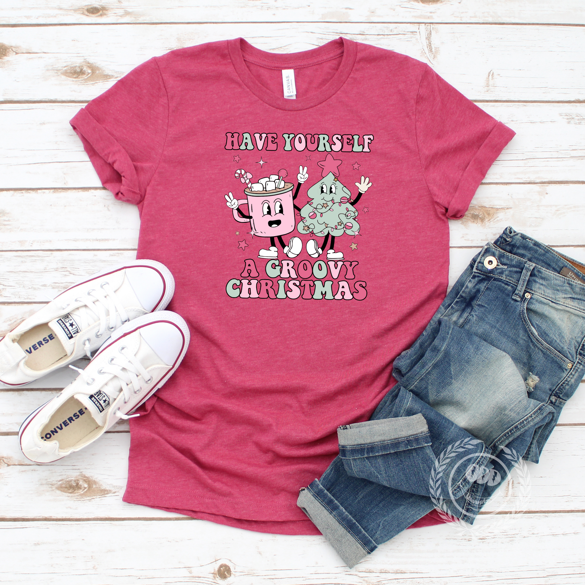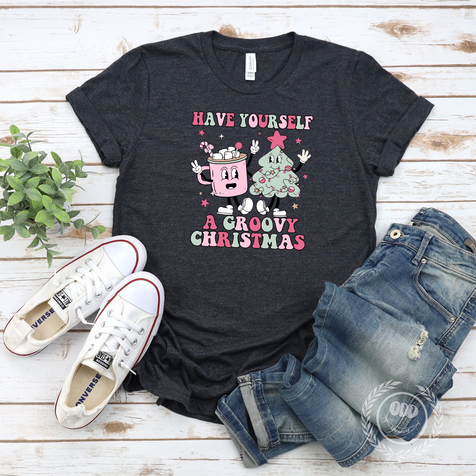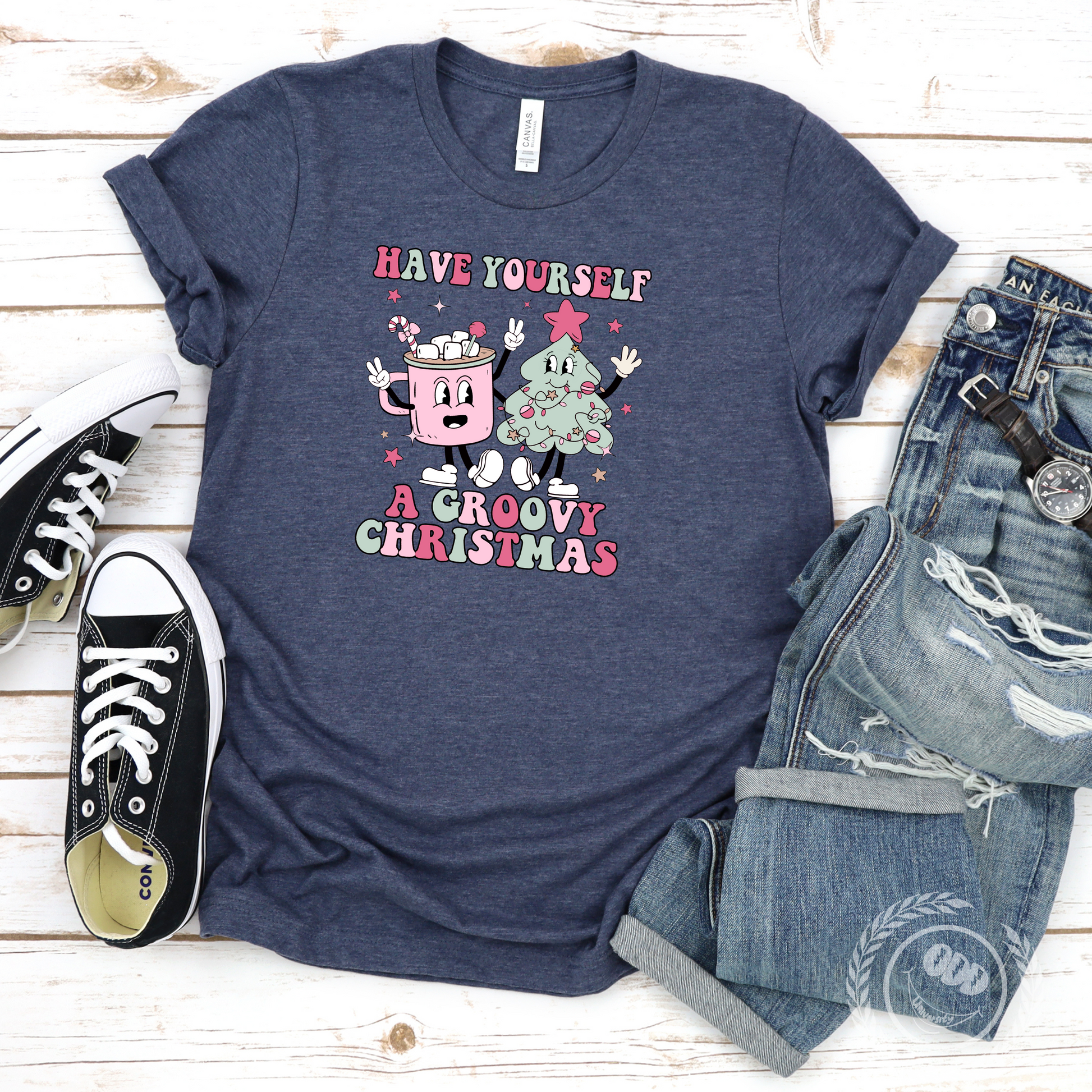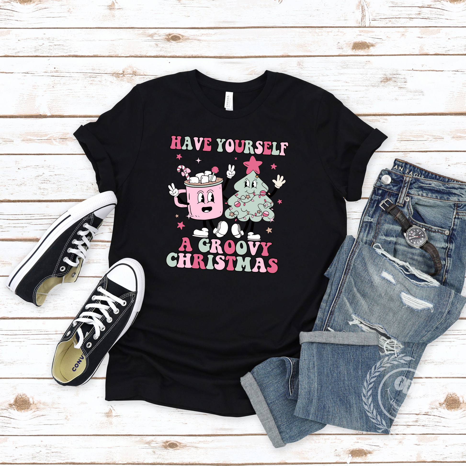 A festive T-shirt featuring a graphic of a mug of hot cocoa and a Christmas tree with the text 'Have Yourself A Groovy Christmas'. Perfect for spreading holiday cheer and adding a touch of whimsy to your wardrobe. Ideal for those who love Christmas and want to celebrate in a fun and stylish way.