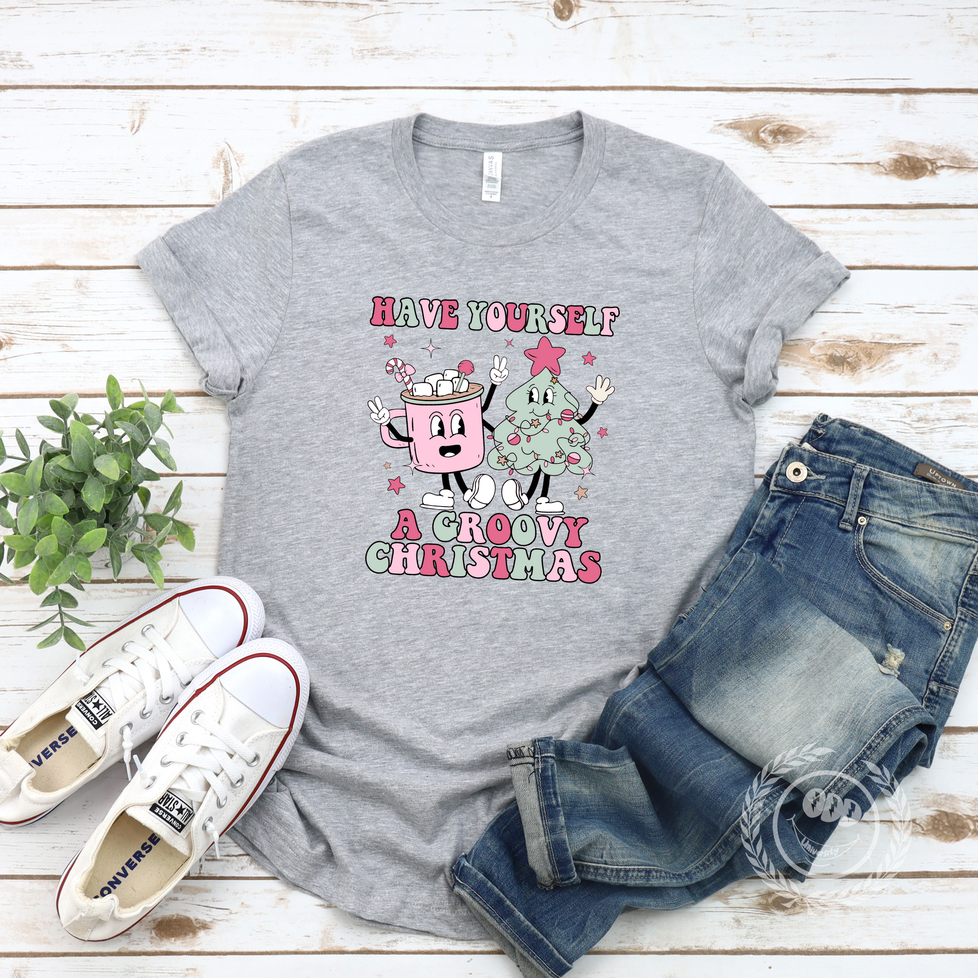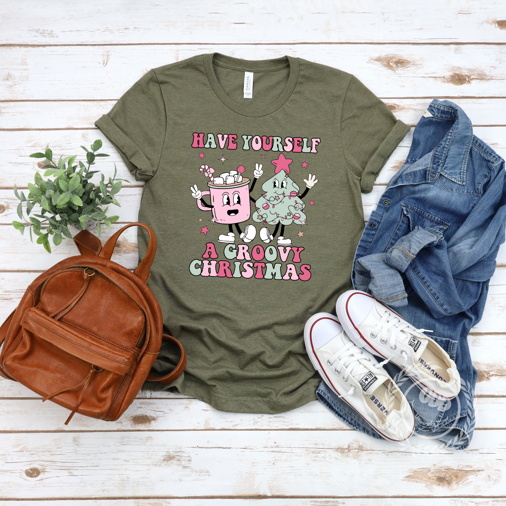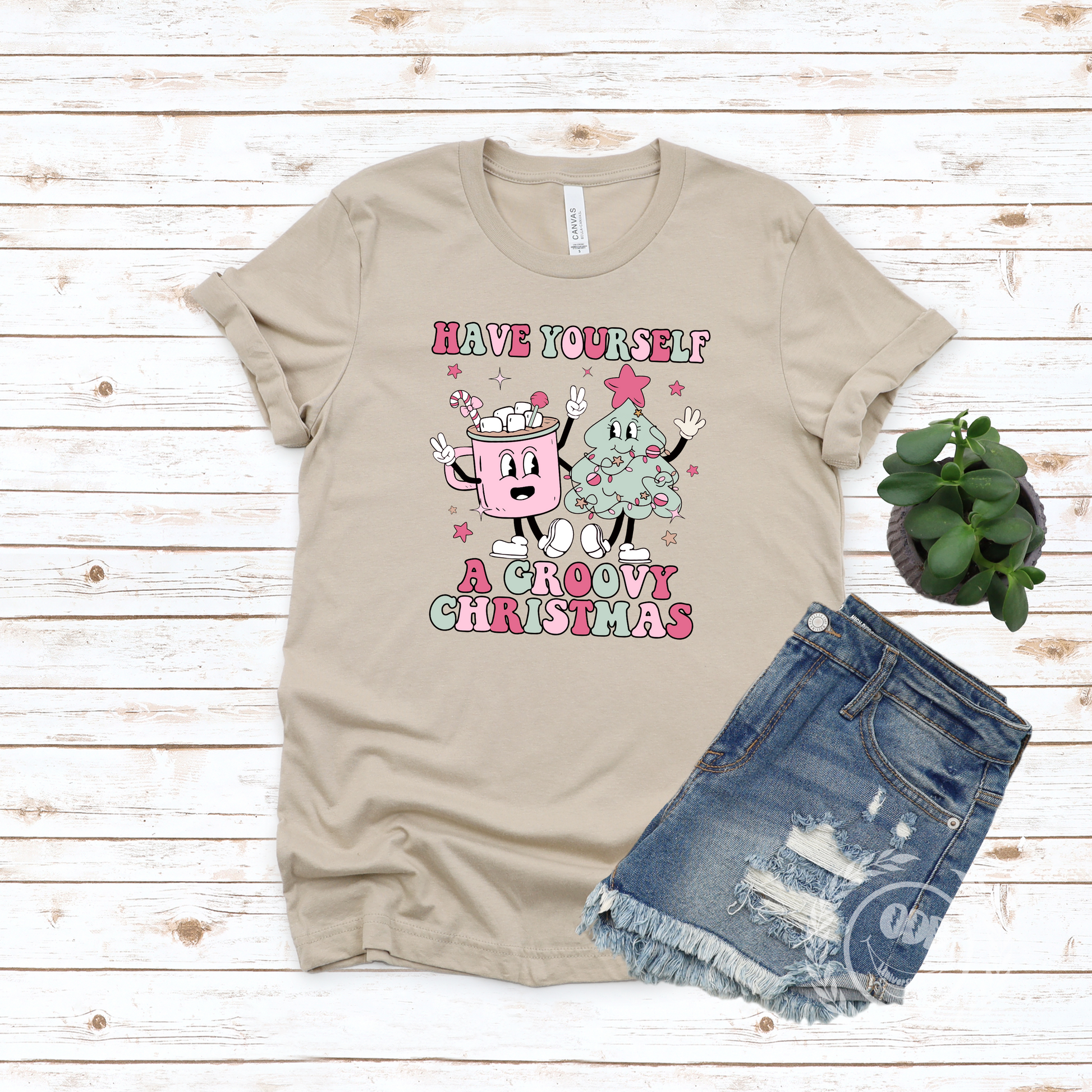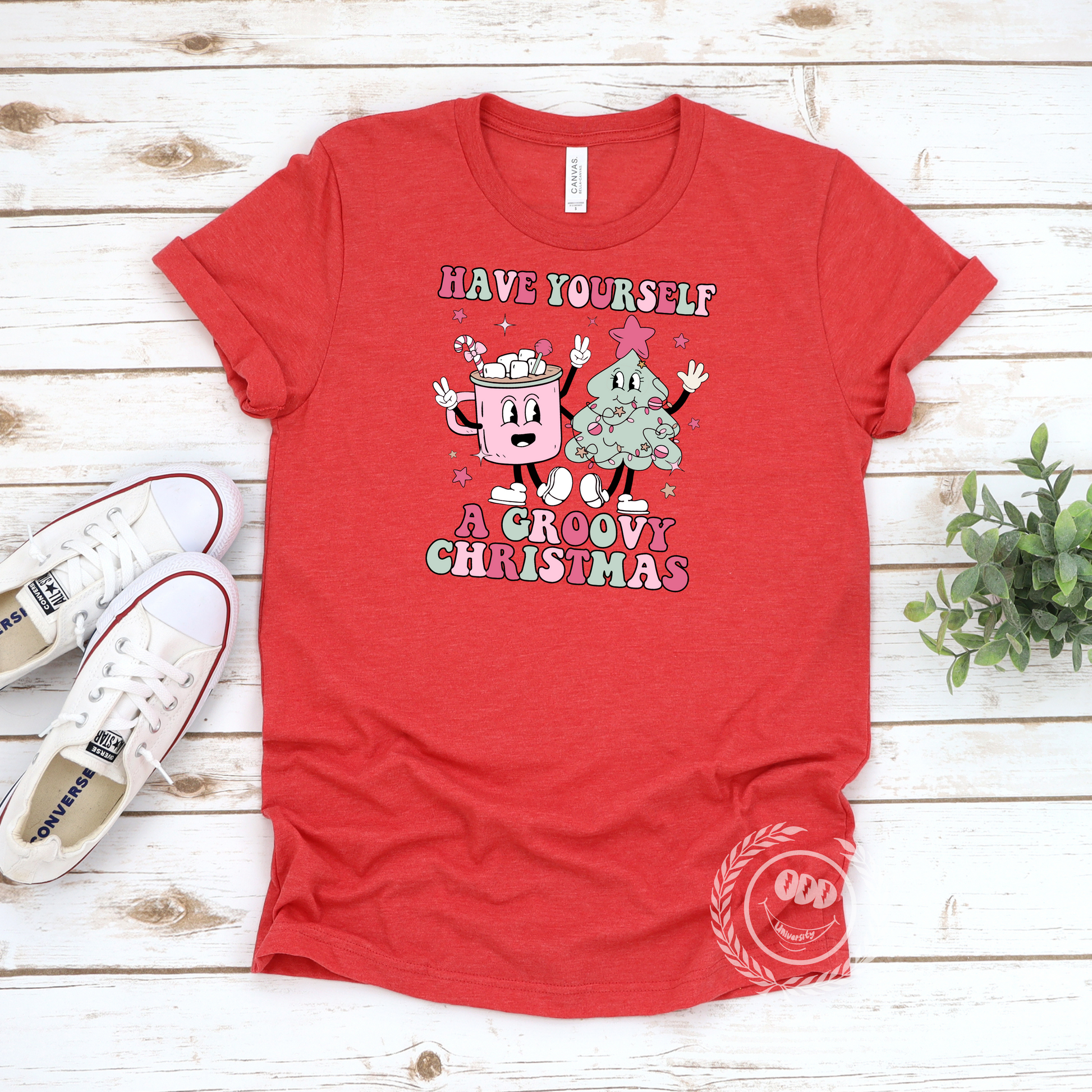 A festive T-shirt featuring a graphic of a mug of hot cocoa and a Christmas tree with the text 'Have Yourself A Groovy Christmas'. Perfect for spreading holiday cheer and adding a touch of whimsy to your wardrobe. Ideal for those who love Christmas and want to celebrate in a fun and stylish way.