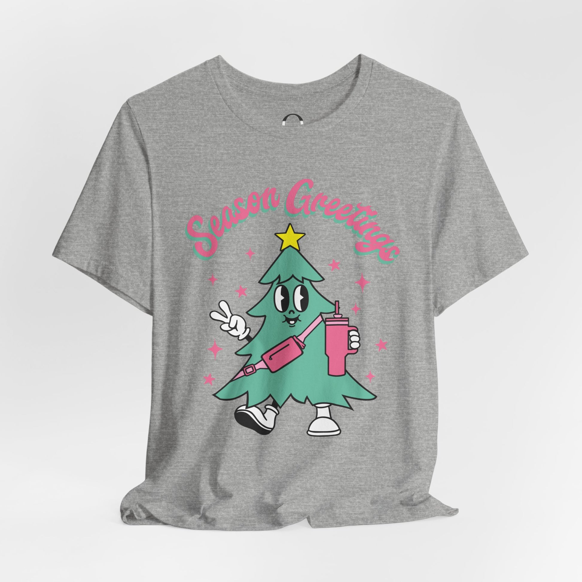 Spread some holiday cheer with this festive T-Shirt featuring a Christmas tree walking with a tumblr in hand and the text 'Seasons Greetings'. Perfect for casual or semi-formal holiday gatherings, this T-Shirt is made with 100% Airlume combed and ring-spun cotton for a lightweight and breathable feel.